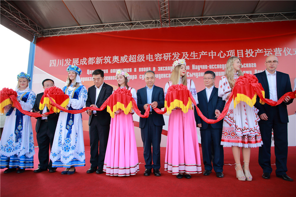 2018年8月29日下午,四川省委常委、成都市委書(shū)記范銳平考察中白工業(yè)園,并與中華人民共和國駐白俄羅斯共和特命全權大使崔啟明,白俄羅斯經(jīng)濟部副部長(cháng)馬圖謝維奇,中白工業(yè)園區管委會(huì )副主任伊戈爾,中白工業(yè)園區開(kāi)發(fā)公司總經(jīng)理李海欣,四川發(fā)展成都市新筑路橋機械股份有限公司董事長(cháng)肖光輝等領(lǐng)導共同為四川發(fā)展成都新筑奧威超級電容研發(fā)及生產(chǎn)中心項目投產(chǎn)運營(yíng)(以下簡(jiǎn)稱(chēng)成都新筑項目)剪彩,李海欣向肖光輝頒發(fā)了中白工業(yè)園“巨石”貢獻獎證書(shū)及獎?wù)隆?