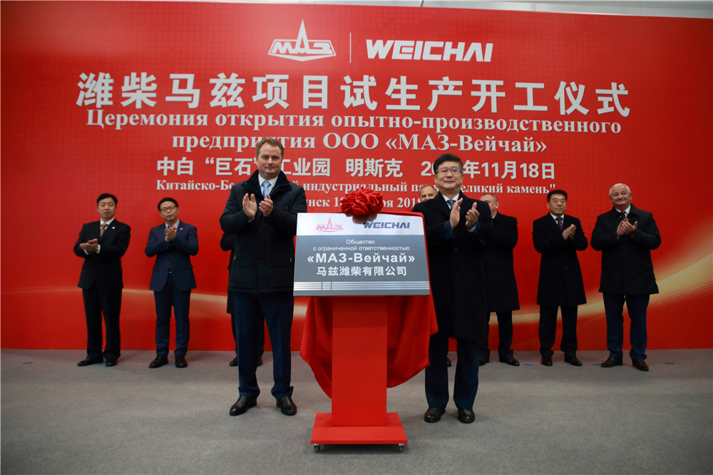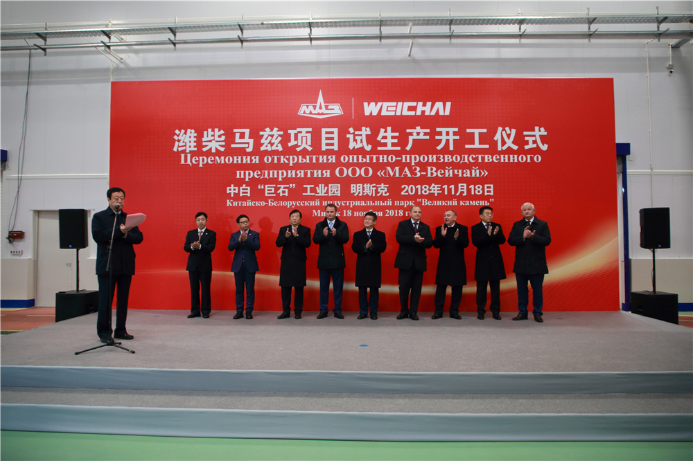 2018年11月18上午,濰柴馬茲項目試生產(chǎn)開(kāi)工儀式在中白工業(yè)園內隆重舉行,白俄羅斯共和國工業(yè)部部長(cháng)烏秋平,中國駐白俄羅斯特命全權大使崔啟明,中白工業(yè)園區管委會(huì )主任亞羅申科,濰柴控股集團有限公司董事長(cháng)譚旭光,馬茲集團總經(jīng)理卡特里尼奇,開(kāi)發(fā)公司總經(jīng)理李海欣等領(lǐng)導出席了本次活動(dòng)。在熱烈的掌聲中,烏秋平和崔啟明共同為濰柴馬茲項目揭牌,隨后,譚旭光與卡特里尼奇共同按下了象征項目投產(chǎn)的啟動(dòng)按鈕。