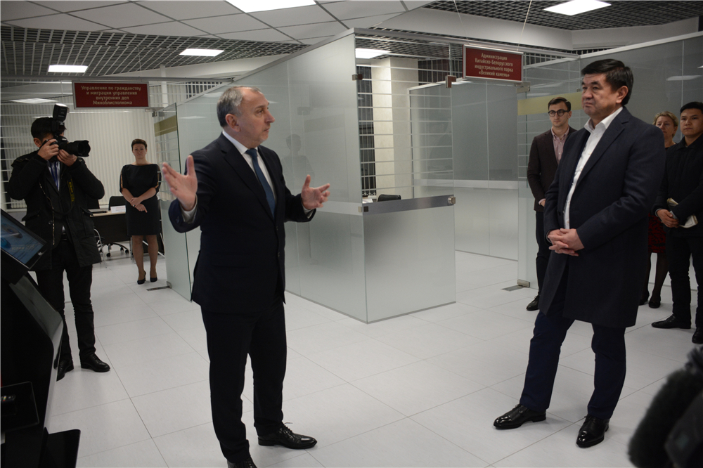 在管委會(huì )“一站式”服務(wù)大廳,亞羅申科向阿布爾加濟耶夫總理介紹了管委會(huì )為居民企業(yè)提供一站式服務(wù)的相關(guān)內容,并闡述了中白工業(yè)園管委會(huì )在學(xué)習中國園區開(kāi)發(fā)經(jīng)驗時(shí)的做法。