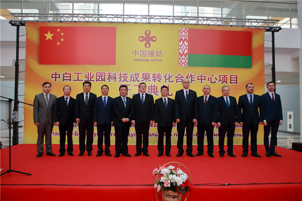2018年12月18日上午,科技成果轉化合作中心大樓開(kāi)工典禮在中白工業(yè)園舉行。中國駐白俄羅斯特命全權大使崔啟明,白俄羅斯國家科學(xué)院技術(shù)委員會(huì )主席舒米林,白俄羅斯經(jīng)濟部副部長(cháng)馬圖謝維奇,白俄羅斯國家科學(xué)院第一副主席齊日科,中白工業(yè)園區管委會(huì )主任亞羅申科,斯莫列維奇區副區長(cháng)薩斯科維奇,中國駐白俄羅斯大使館經(jīng)濟商務(wù)參贊楊修敏,開(kāi)發(fā)公司CEO胡政,園區開(kāi)發(fā)公司總經(jīng)理李海欣、第一副總經(jīng)理基里爾等出席了開(kāi)工典禮。