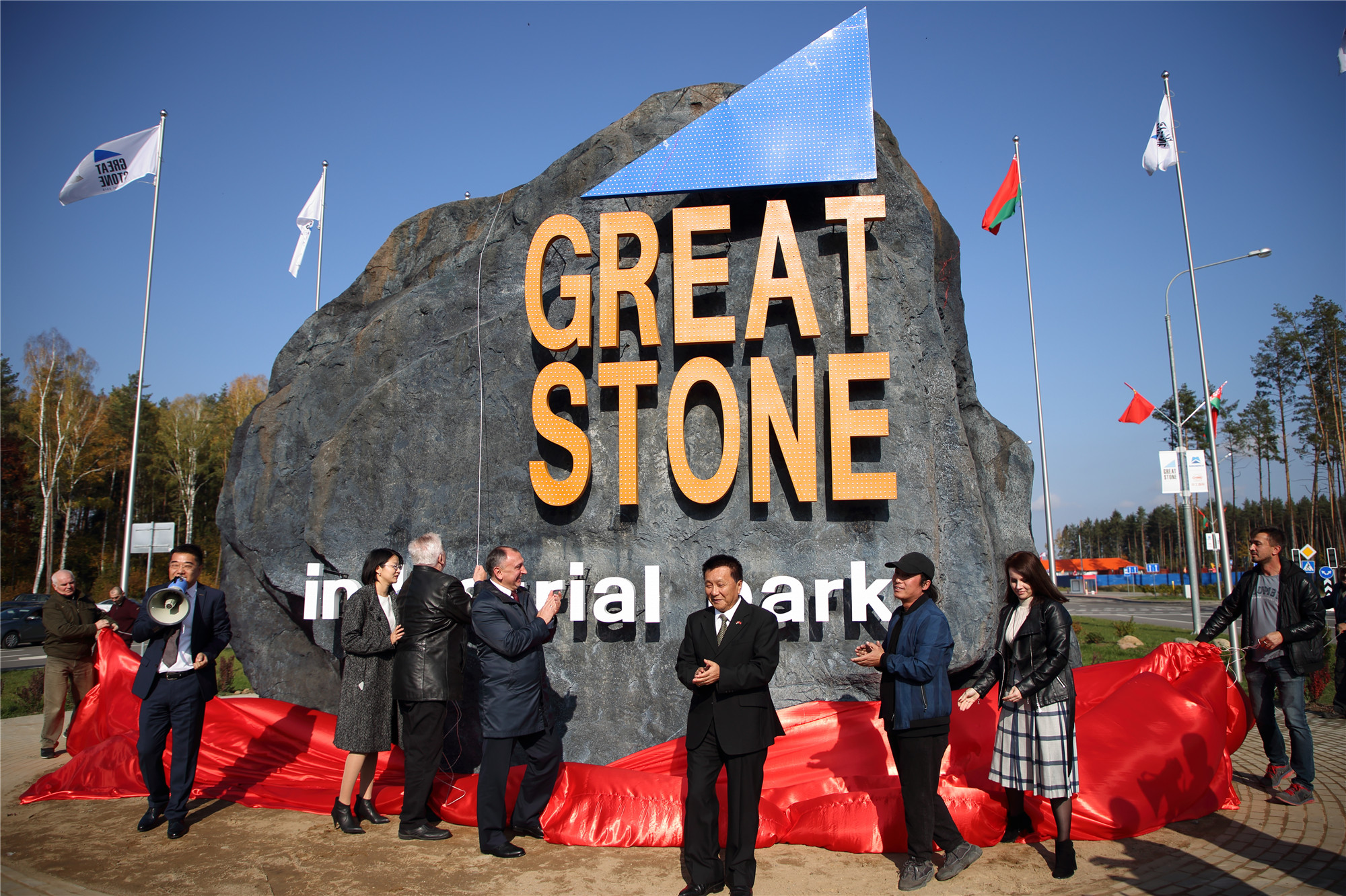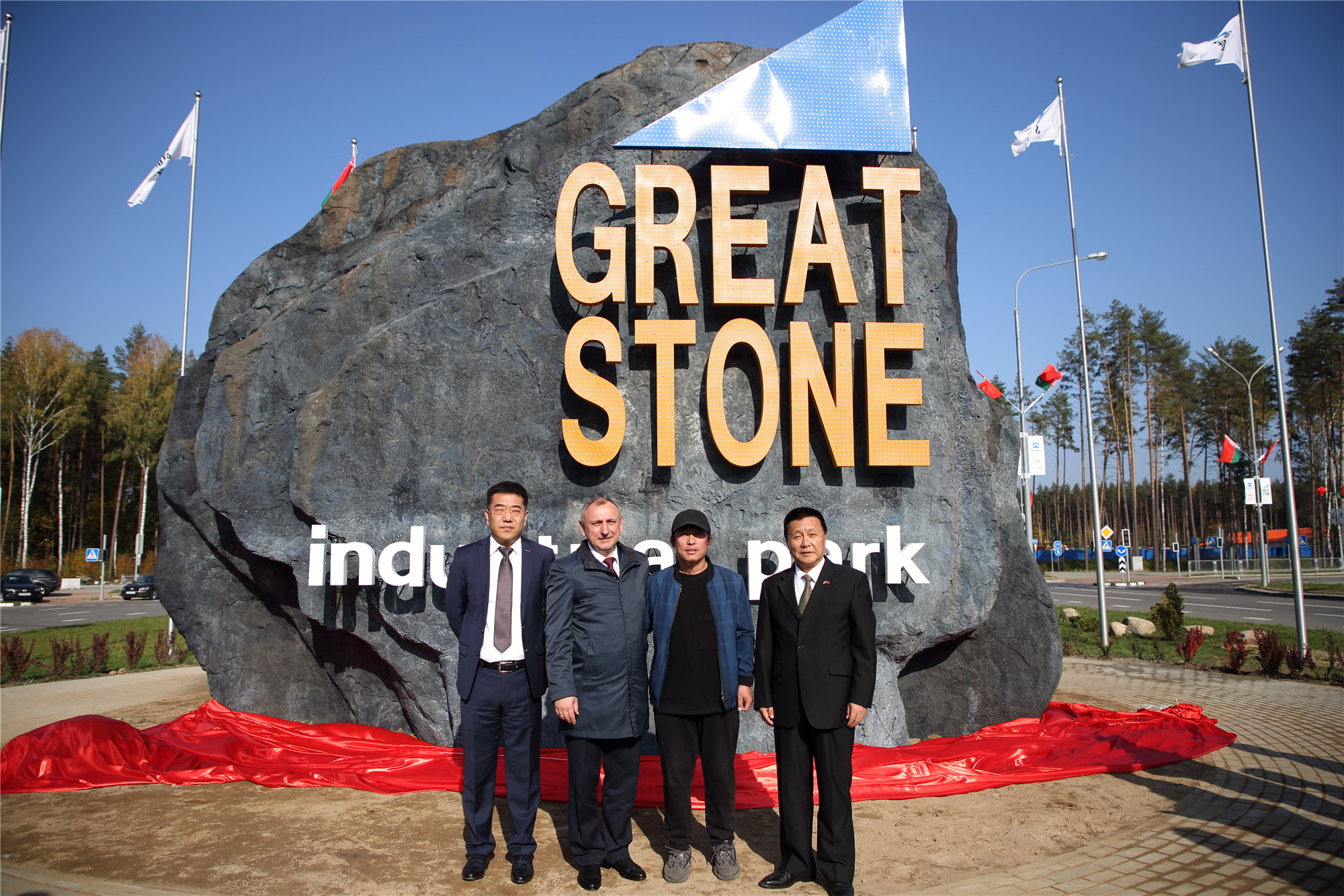 2018年10月11日上午,中白工業(yè)園在園區1號路主入口處舉行了“巨石”標志揭牌儀式。參加此儀式的有中白工業(yè)園區管委會(huì )主任亞羅申科,中白工業(yè)園區開(kāi)發(fā)股份有限公司CEO胡政、總經(jīng)理李海欣等。