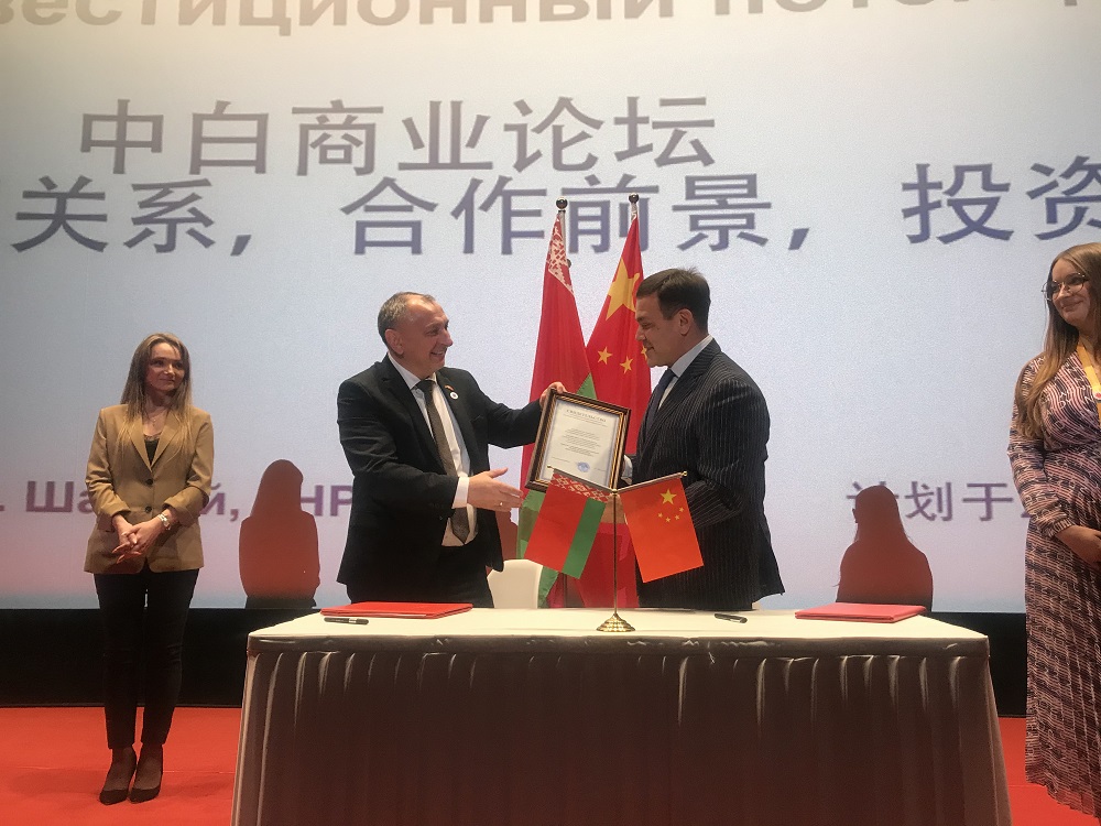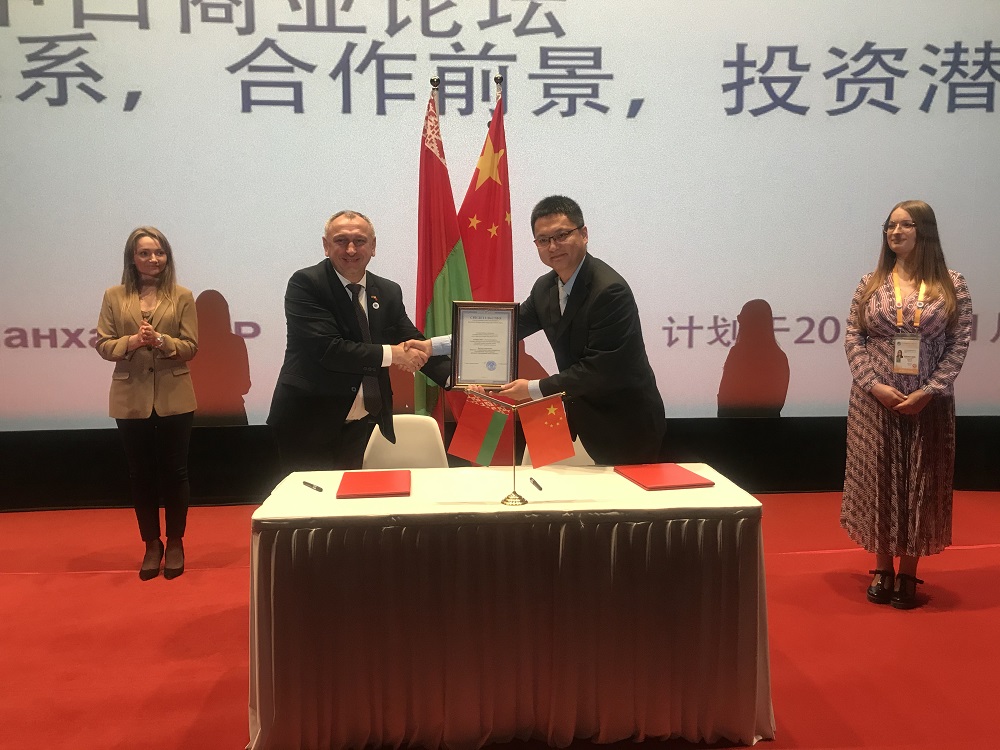 2019年11月6日下午,在第二屆中國國際進(jìn)口博覽會(huì )期間,中白商業(yè)論壇在上海綠地全球商品貿易港隆重舉行。中國商務(wù)部副部長(cháng)俞建華、白俄羅斯農業(yè)與商品部部長(cháng)霍奇科·阿納托里、白俄羅斯駐華大使魯德·基里爾、園區管委會(huì )主任雅羅申科·亞歷山大、園區開(kāi)發(fā)公司CEO胡政、園區開(kāi)發(fā)公司總經(jīng)理嚴剛及來(lái)自?xún)蓢恼探绱砉灿?00余人參加會(huì )議。
