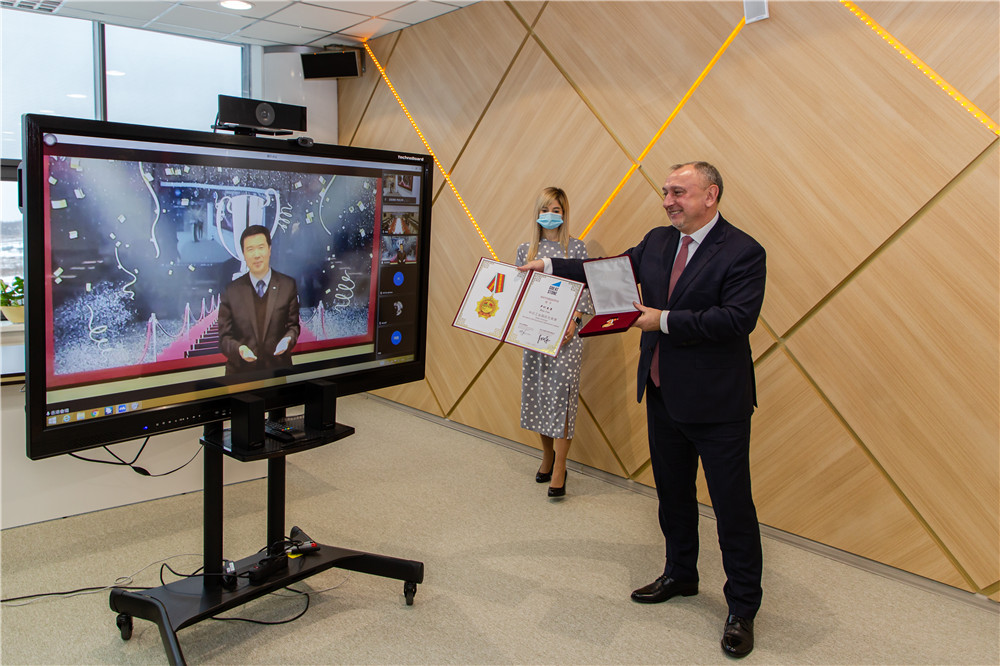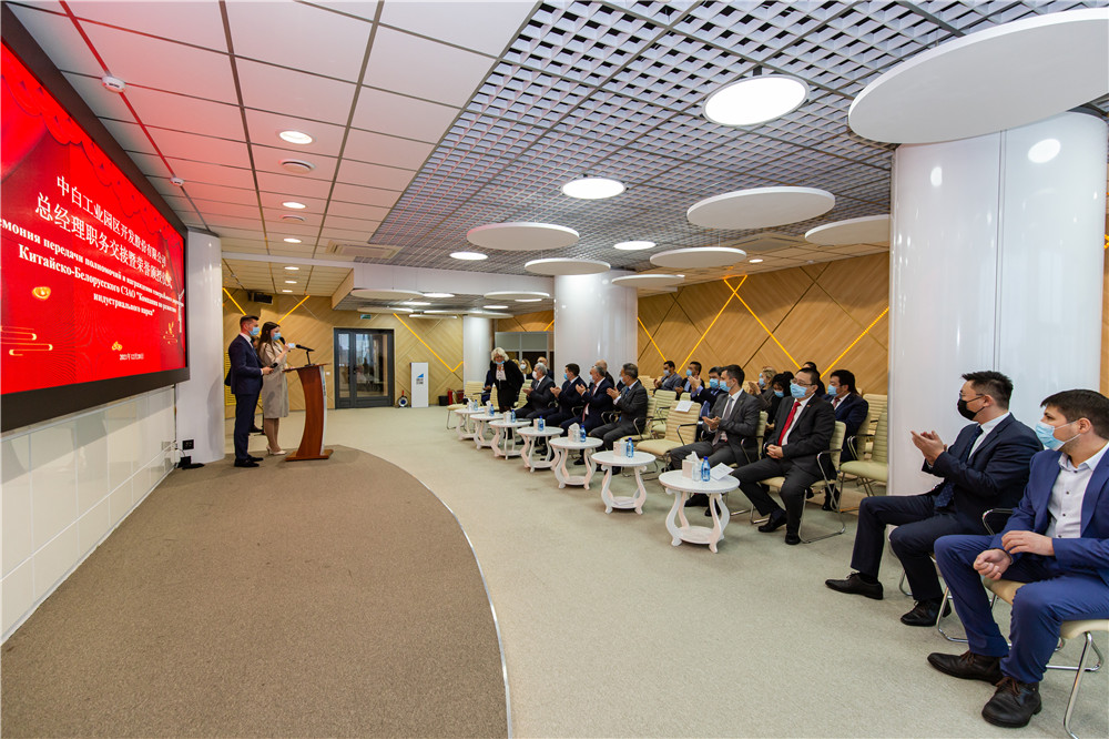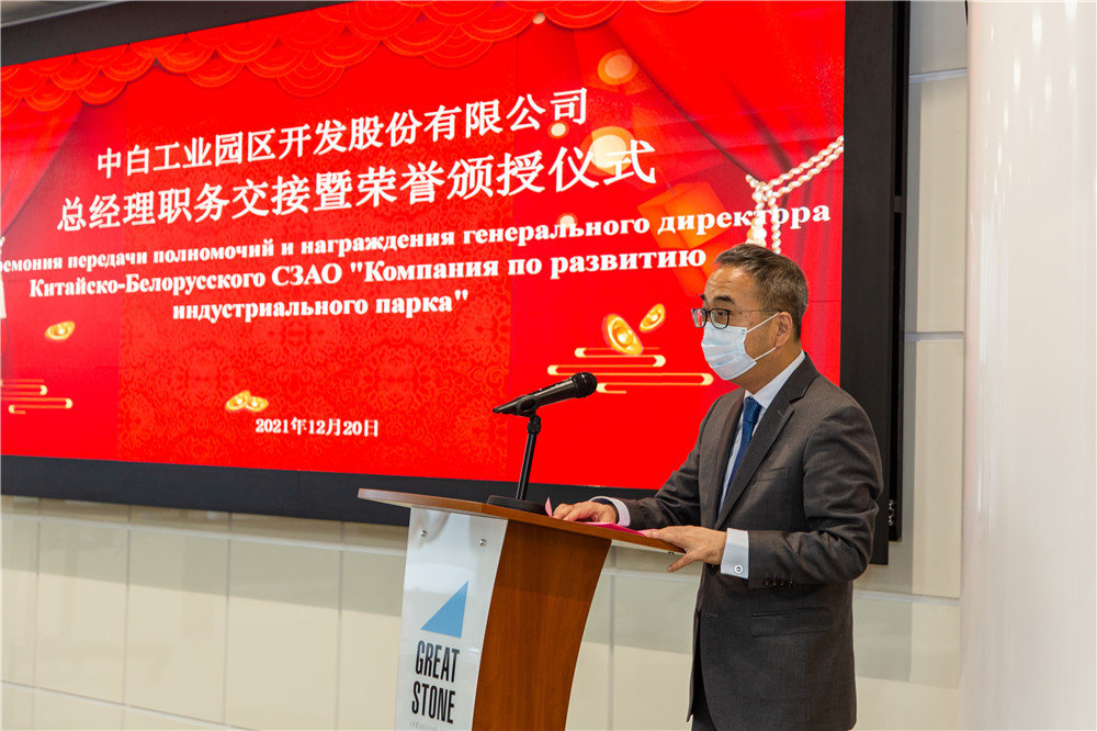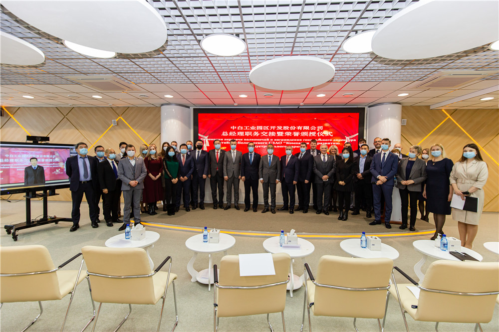 2021年12月20日,中白工業(yè)園區開(kāi)發(fā)股份有限公司舉行總經(jīng)理職務(wù)交接暨榮譽(yù)頒授儀式,管委會(huì )主任亞羅申科,招商局集團駐中亞及波羅的海地區代表處首席代表、駐白俄羅斯代表處首席代表、中白工業(yè)園區開(kāi)發(fā)公司總經(jīng)理李鐘漢,管委會(huì )第一副主任雅克莫夫,副主任塔巴紐霍夫,副主任切爾卡索瓦及開(kāi)發(fā)公司管理層等出席本次活動(dòng),離任總經(jīng)理嚴剛以視頻形式出席活動(dòng)。會(huì )上,開(kāi)發(fā)公司第一副總經(jīng)理卡羅杰耶夫宣讀了公司董事會(huì )關(guān)于總經(jīng)理職務(wù)交接的命令。