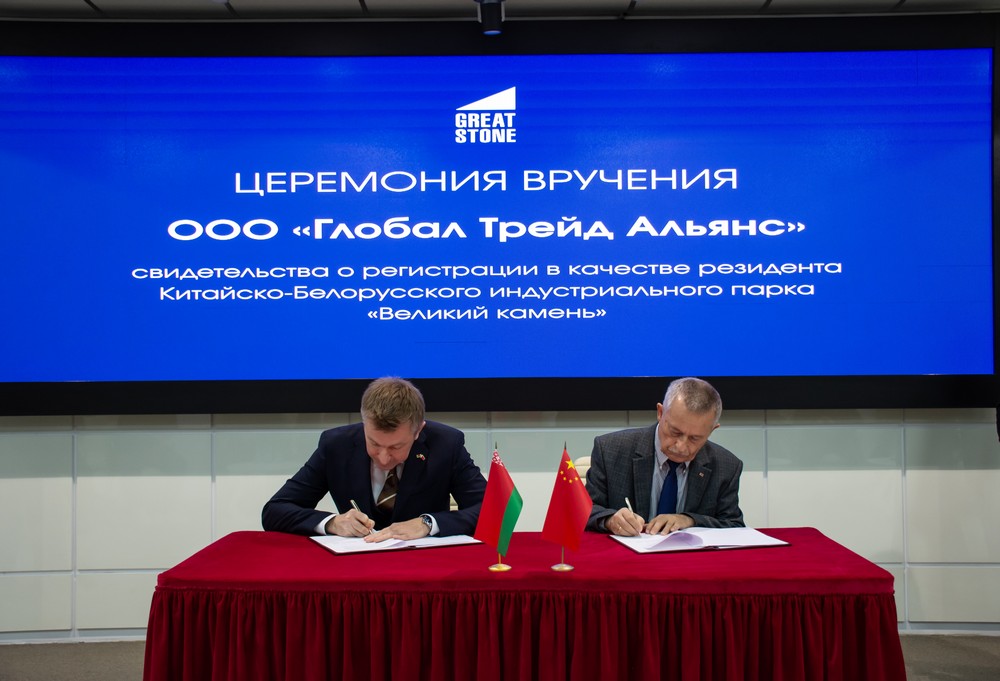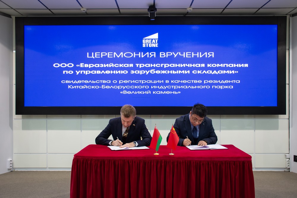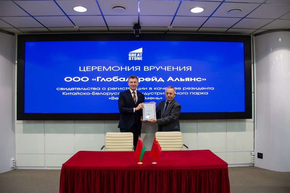 2025年12月5日,中白工業(yè)園隆重舉行居民企業(yè)入園儀式。園區管委會(huì )第一副主任列別江采夫向環(huán)球貿易聯(lián)盟有限責任公司、歐亞跨境海外倉管理有限責任公司的代表正式頒發(fā)居民企業(yè)證書(shū)。