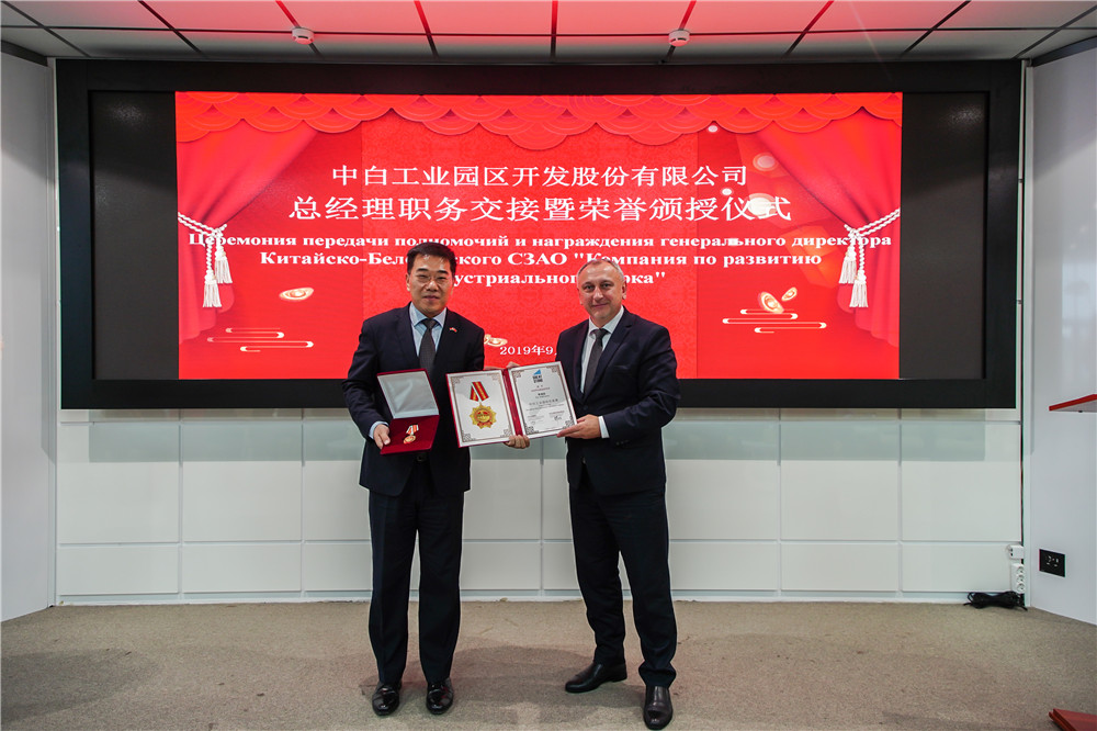 2019年9月30日,中白工業(yè)園開(kāi)發(fā)公司舉行巨石獎?wù)骂C授儀式, 園區管委會(huì )主任亞羅申科、開(kāi)發(fā)公司CEO胡政、開(kāi)發(fā)公司管理層等領(lǐng)導出席了儀式。管委會(huì )主任亞羅申科為李海欣...201909-30