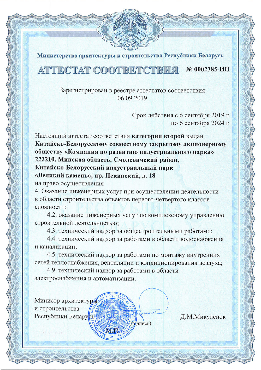 2019年9月6日,中白工園區開(kāi)發(fā)股份有限公司獲得白俄羅斯二級工程管理服務(wù)資質(zhì)。據了解,獲得該資質(zhì)后,開(kāi)發(fā)公司可為二—四級建筑項目提供相關(guān)工程管理服務(wù),其中包括全...201909-20